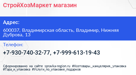 СтройХозМаркет, магазин по адресу 600037, Владимирская область, Владимир, Нижняя Дуброва, 13 в дальнейшем Организация, размещена в следующих категориях: