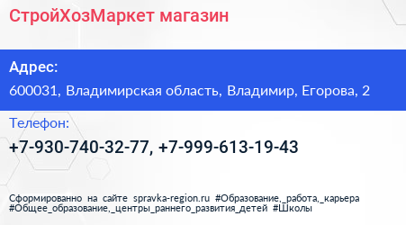 СтройХозМаркет, магазин по адресу 600031, Владимирская область, Владимир, Егорова, 2 в дальнейшем Организация, размещена в следующих категориях: