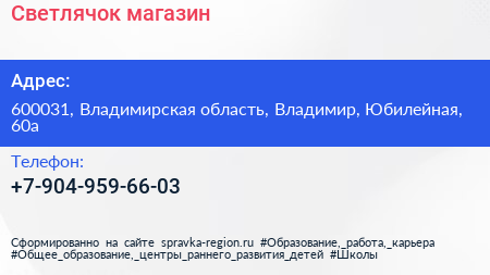 Светлячок, магазин по адресу 600031, Владимирская область, Владимир, Юбилейная, 60а в дальнейшем Организация, размещена в следующих категориях: