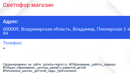 Светофор, магазин по адресу 600009, Владимирская область, Владимир, Пионерская 1-я, 94 в дальнейшем Организация, размещена в следующих категориях: