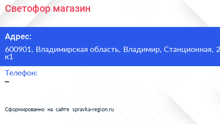 Светофор, магазин по адресу 600901, Владимирская область, Владимир, Станционная, 2 к1 в дальнейшем Организация, размещена в следующих категориях: