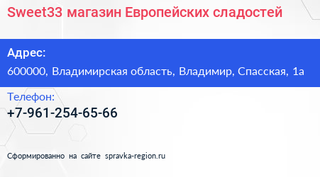 Sweet33, магазин Европейских сладостей по адресу 600000, Владимирская область, Владимир, Спасская, 1а в дальнейшем Организация, размещена в следующих категориях: