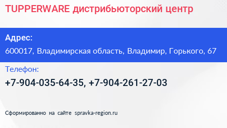 TUPPERWARE, дистрибьюторский центр по адресу 600017, Владимирская область, Владимир, Горького, 67 в дальнейшем Организация, размещена в следующих категориях: