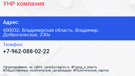 УНР, компания по адресу 600032, Владимирская область, Владимир, Добросельская, 230а в дальнейшем Организация, размещена в следующих категориях: