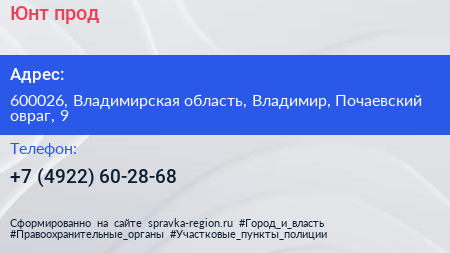 Юнт-прод по адресу 600026, Владимирская область, Владимир, Почаевский овраг, 9 в дальнейшем Организация, размещена в следующих категориях:
