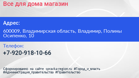 Все для дома, магазин по адресу 600009, Владимирская область, Владимир, Полины Осипенко, 10 в дальнейшем Организация, размещена в следующих категориях: