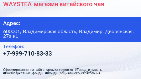 WAYSTEA, магазин китайского чая по адресу 600001, Владимирская область, Владимир, Дворянская, 27а к1 в дальнейшем Организация, размещена в следующих категориях: