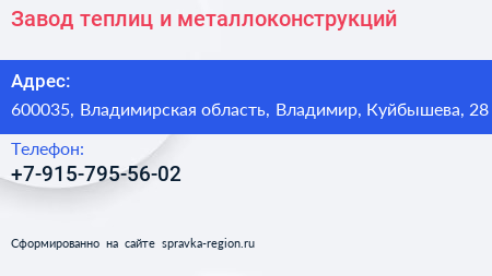 Завод теплиц и металлоконструкций по адресу 600035, Владимирская область, Владимир, Куйбышева, 28 в дальнейшем Организация, размещена в следующих категориях: