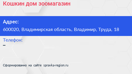 Кошкин дом, зоомагазин по адресу 600020, Владимирская область, Владимир, Труда, 18 в дальнейшем Организация, размещена в следующих категориях: