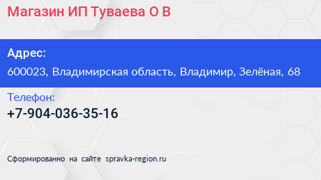 Магазин, ИП Туваева О.В. по адресу 600023, Владимирская область, Владимир, Зелёная, 68 в дальнейшем Организация, размещена в следующих категориях: