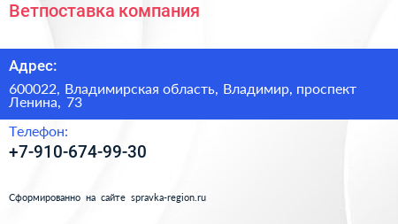 Ветпоставка, компания по адресу 600022, Владимирская область, Владимир, проспект Ленина, 73 в дальнейшем Организация, размещена в следующих категориях: