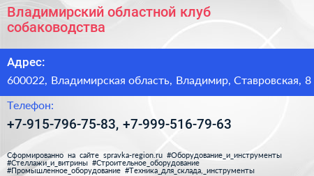 Владимирский областной клуб собаководства по адресу 600022, Владимирская область, Владимир, Ставровская, 8 в дальнейшем Организация, размещена в следующих категориях: