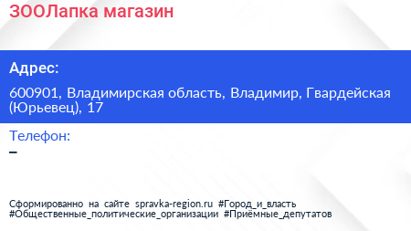 ЗООЛапка, магазин по адресу 600901, Владимирская область, Владимир, Гвардейская (Юрьевец), 17 в дальнейшем Организация, размещена в следующих категориях: