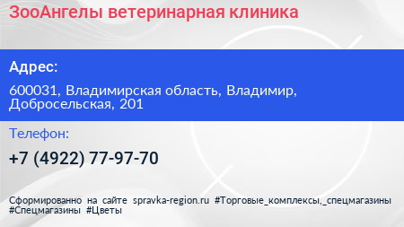 ЗооАнгелы, ветеринарная клиника по адресу 600031, Владимирская область, Владимир, Добросельская, 201 в дальнейшем Организация, размещена в следующих категориях: