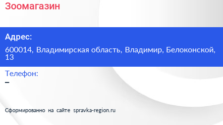 Зоомагазин по адресу 600014, Владимирская область, Владимир, Белоконской, 13 в дальнейшем Организация, размещена в следующих категориях: