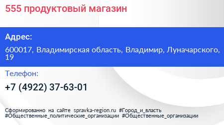 555, продуктовый магазин по адресу 600017, Владимирская область, Владимир, Луначарского, 19 в дальнейшем Организация, размещена в следующих категориях: