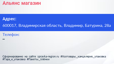 Альянс, магазин по адресу 600017, Владимирская область, Владимир, Батурина, 28а в дальнейшем Организация, размещена в следующих категориях: