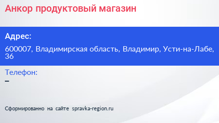 Анкор, продуктовый магазин по адресу 600007, Владимирская область, Владимир, Усти-на-Лабе, 36 в дальнейшем Организация, размещена в следующих категориях: