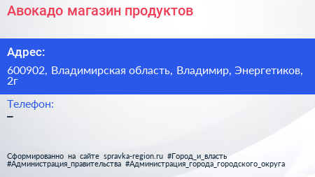 Авокадо, магазин продуктов по адресу 600902, Владимирская область, Владимир, Энергетиков, 2г в дальнейшем Организация, размещена в следующих категориях: