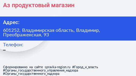 Аз, продуктовый магазин по адресу 601252, Владимирская область, Владимир, Преображенская, 93 в дальнейшем Организация, размещена в следующих категориях: