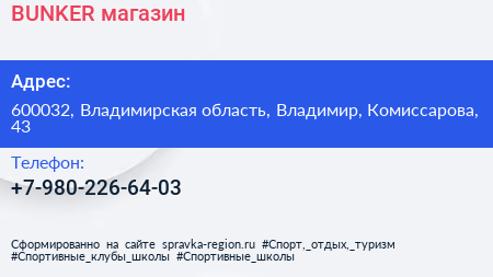 BUNKER, магазин по адресу 600032, Владимирская область, Владимир, Комиссарова, 43 в дальнейшем Организация, размещена в следующих категориях: