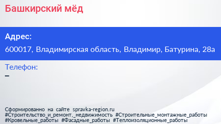 Башкирский мёд по адресу 600017, Владимирская область, Владимир, Батурина, 28а в дальнейшем Организация, размещена в следующих категориях: