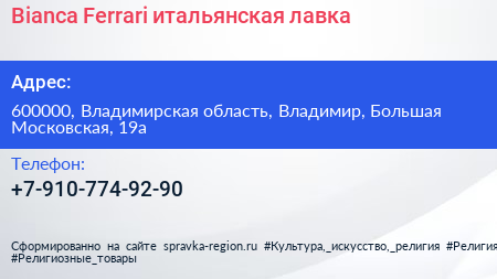 Bianca Ferrari, итальянская лавка по адресу 600000, Владимирская область, Владимир, Большая Московская, 19а в дальнейшем Организация, размещена в следующих категориях: