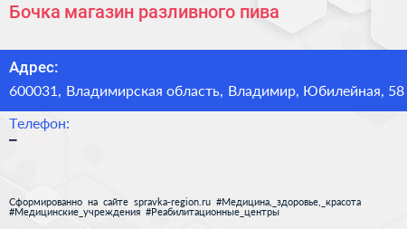 Бочка, магазин разливного пива по адресу 600031, Владимирская область, Владимир, Юбилейная, 58 в дальнейшем Организация, размещена в следующих категориях: