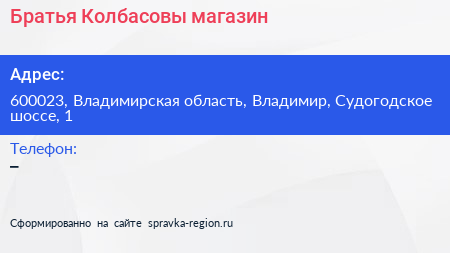 Братья Колбасовы, магазин по адресу 600023, Владимирская область, Владимир, Судогодское шоссе, 1 в дальнейшем Организация, размещена в следующих категориях: