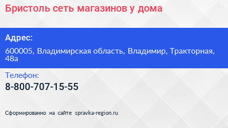 Бристоль, сеть магазинов у дома по адресу 600005, Владимирская область, Владимир, Тракторная, 48а в дальнейшем Организация, размещена в следующих категориях: