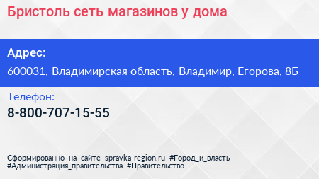 Бристоль, сеть магазинов у дома по адресу 600031, Владимирская область, Владимир, Егорова, 8Б в дальнейшем Организация, размещена в следующих категориях: