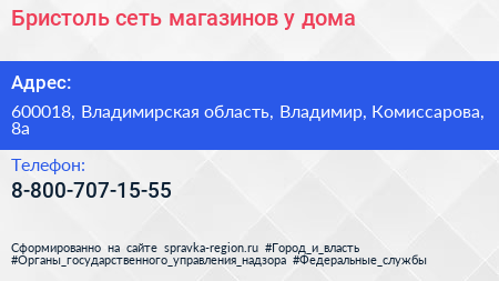 Бристоль, сеть магазинов у дома по адресу 600018, Владимирская область, Владимир, Комиссарова, 8а в дальнейшем Организация, размещена в следующих категориях: