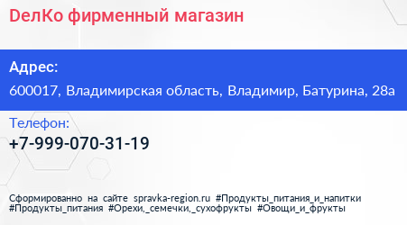 DелКо, фирменный магазин по адресу 600017, Владимирская область, Владимир, Батурина, 28а в дальнейшем Организация, размещена в следующих категориях: