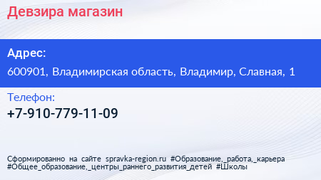 Девзира, магазин по адресу 600901, Владимирская область, Владимир, Славная, 1 в дальнейшем Организация, размещена в следующих категориях: