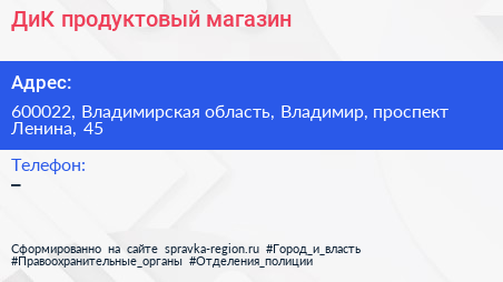 ДиК, продуктовый магазин по адресу 600022, Владимирская область, Владимир, проспект Ленина, 45 в дальнейшем Организация, размещена в следующих категориях: