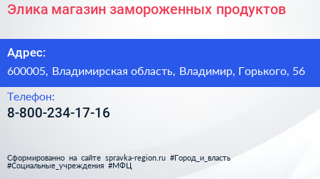 Элика, магазин замороженных продуктов по адресу 600005, Владимирская область, Владимир, Горького, 56 в дальнейшем Организация, размещена в следующих категориях: