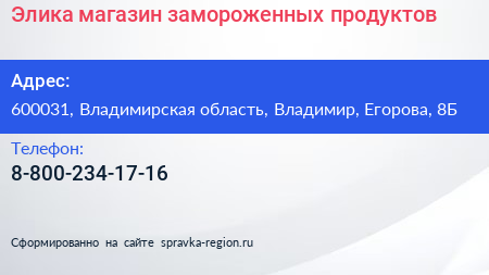 Элика, магазин замороженных продуктов по адресу 600031, Владимирская область, Владимир, Егорова, 8Б в дальнейшем Организация, размещена в следующих категориях: