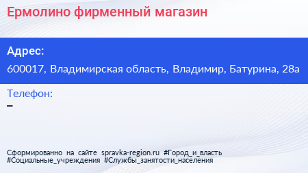 Ермолино, фирменный магазин по адресу 600017, Владимирская область, Владимир, Батурина, 28а в дальнейшем Организация, размещена в следующих категориях: