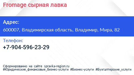 Fromage, сырная лавка по адресу 600007, Владимирская область, Владимир, Мира, 82 в дальнейшем Организация, размещена в следующих категориях: