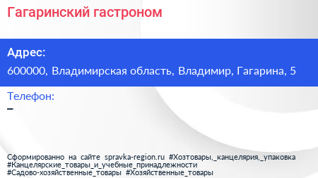Гагаринский, гастроном по адресу 600000, Владимирская область, Владимир, Гагарина, 5 в дальнейшем Организация, размещена в следующих категориях: