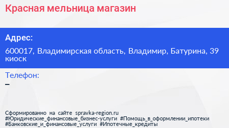 Красная мельница, магазин по адресу 600017, Владимирская область, Владимир, Батурина, 39 киоск в дальнейшем Организация, размещена в следующих категориях: