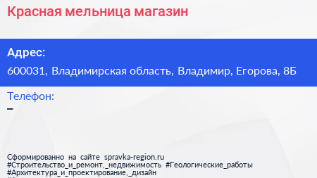 Красная мельница, магазин по адресу 600031, Владимирская область, Владимир, Егорова, 8Б в дальнейшем Организация, размещена в следующих категориях: