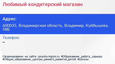 Любимый, кондитерский магазин по адресу 600035, Владимирская область, Владимир, Куйбышева, 58Б в дальнейшем Организация, размещена в следующих категориях: