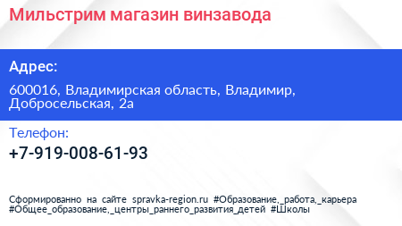 Мильстрим, магазин винзавода по адресу 600016, Владимирская область, Владимир, Добросельская, 2а в дальнейшем Организация, размещена в следующих категориях: