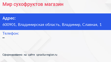 Мир сухофруктов, магазин по адресу 600901, Владимирская область, Владимир, Славная, 1 в дальнейшем Организация, размещена в следующих категориях: