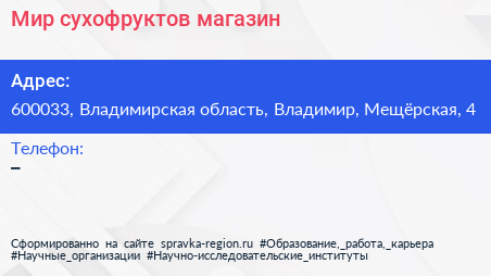 Мир сухофруктов, магазин по адресу 600033, Владимирская область, Владимир, Мещёрская, 4 в дальнейшем Организация, размещена в следующих категориях: