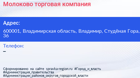 Молоково, торговая компания по адресу 600001, Владимирская область, Владимир, Студёная Гора, 36 в дальнейшем Организация, размещена в следующих категориях: