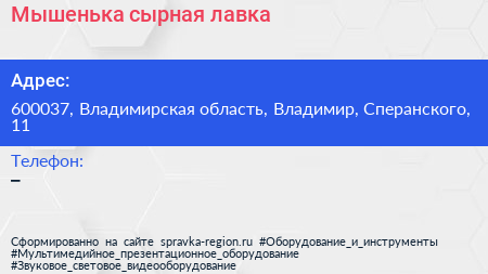Мышенька, сырная лавка по адресу 600037, Владимирская область, Владимир, Сперанского, 11 в дальнейшем Организация, размещена в следующих категориях: