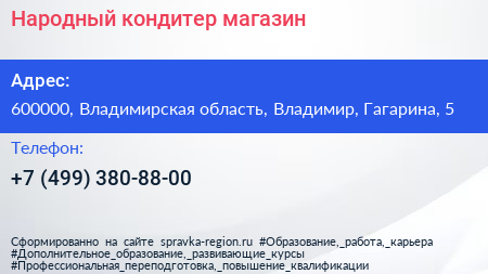 Народный кондитер, магазин по адресу 600000, Владимирская область, Владимир, Гагарина, 5 в дальнейшем Организация, размещена в следующих категориях: