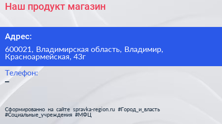 Наш продукт, магазин по адресу 600021, Владимирская область, Владимир, Красноармейская, 43г в дальнейшем Организация, размещена в следующих категориях: